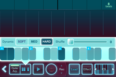 The numbered vertical bars represent one beat. Tap to create short notes; tap and drag to create long notes. Tap to remove notes, or tap and drag to erase a section. Adjust the intensity of each note's dynamic by selecting Soft, Med or Hard before adding notes to the pattern.