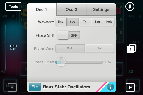 The Synths tool is an editor for creating and saving new, custom synth sounds for use with DopplerPad. While editing a synth, use the test pad on the left to hear what it sounds like.